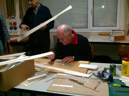 We zijn eind November voor het eerst bij elkaar geweest om plannen te maken en de tekening te bekijken. Gard kwam met het idee om snij mallen te maken van metaal en dat is geweldig gelukt, je vind er een foto van in de collage. Ik zelf had het proleem om de gaatjes in de balsa ribben te boren, gaat nooit netjes, Willy had de oplossing snijbuisjes Het volgende probleem er waren nog al veel Carbon pijpjes nodig, en die zijn duur, Gerard en Giep zijn op het internet gaan zoeken en ik zelf ben bij Hobby-In wezen kijken, Maar Giep heeft uiteindelijk de Carbon besteld en wel bij CARBON WINKEL in Arnhem.